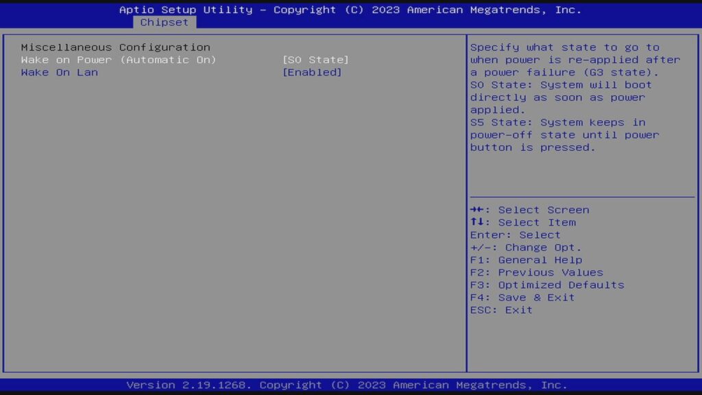 Теперь нужно настроить автоматическое включение ПК при появлении электричества. Идём в раздел Chipset => South Cluster Configuration => Miscellaneous Configuration и меняем параметр Wake on Power (Automatic On) на S0 State.