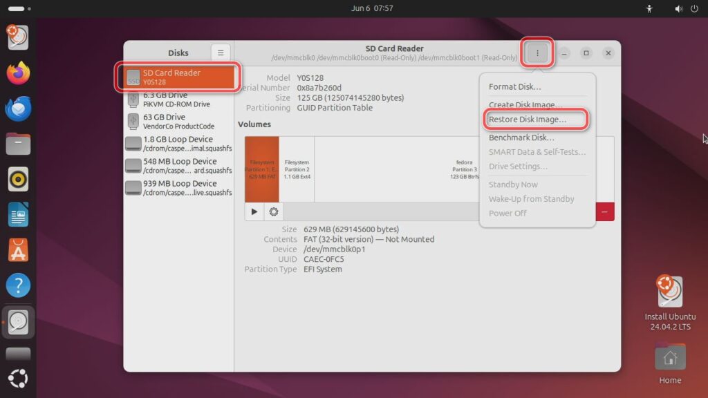 В правой части окна, рядом с кнопками свернуть/развернуть/закрыть, нажимаем на три вертикальные точки и выбираем Restore Disk Image.