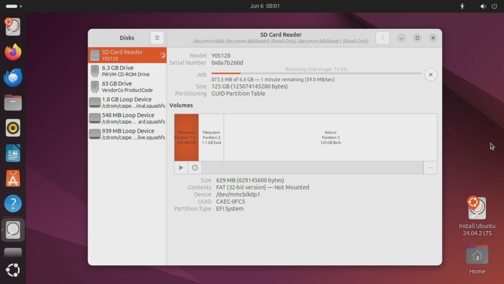 Открываем окно выбора приложений (щёлкните по значку в виде колёсика в левом нижнем углу экрана), находим папку Utilites и запускаем программу Disks. В левой части выбираем диск нашего мини-ПК (он будет помечен как SD-Card Reader).