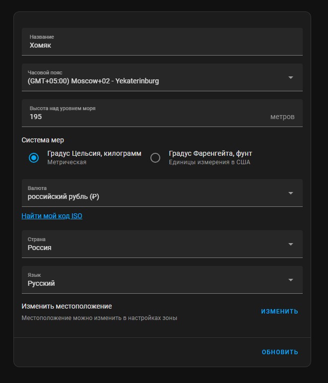 Теперь давайте поможем Home Assistant лучше понять, где именно он находится и какими единицами измерения мы привыкли пользоваться.