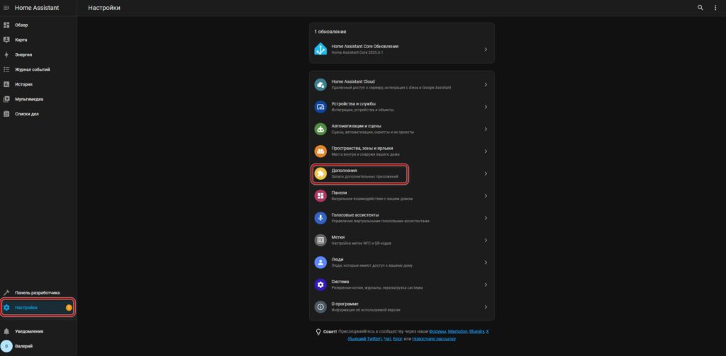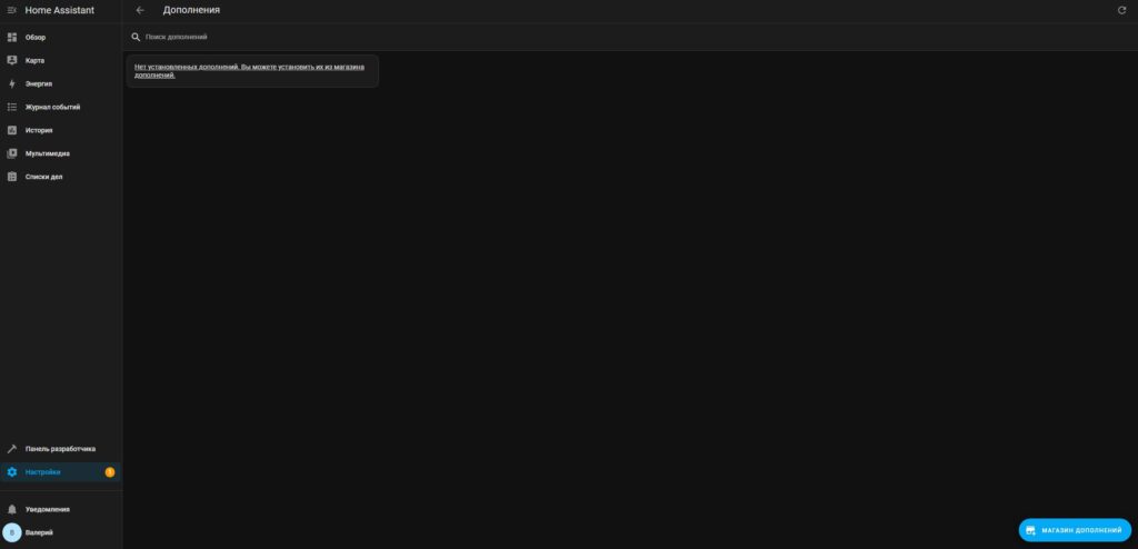 Заходим на главную страницу нашего Home Assistant (вы ведь помните его адрес?) и переходим в меню настроек. Далее выбираем раздел “Дополнения”.