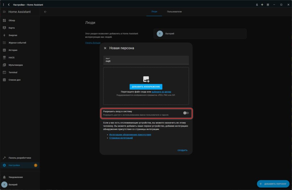 Назовём нашего героя просто и со вкусом: “mqtt”. Не забудем активировать опцию “Разрешить вход в систему”, чтобы указать пароль.