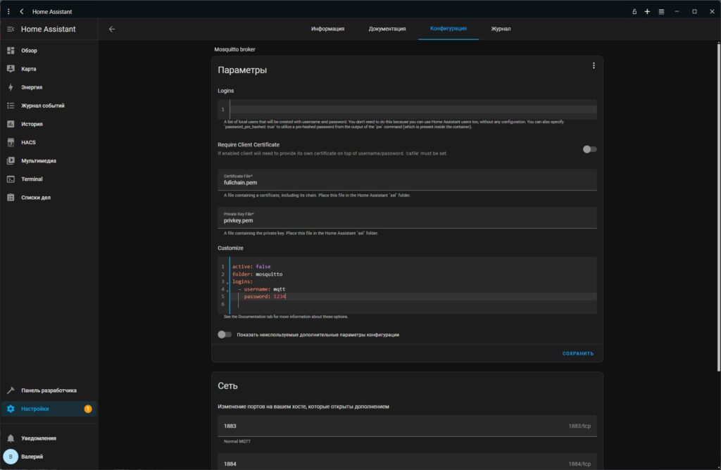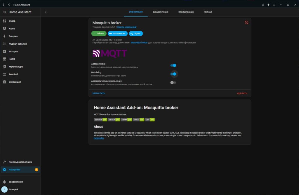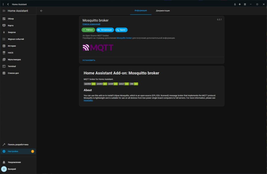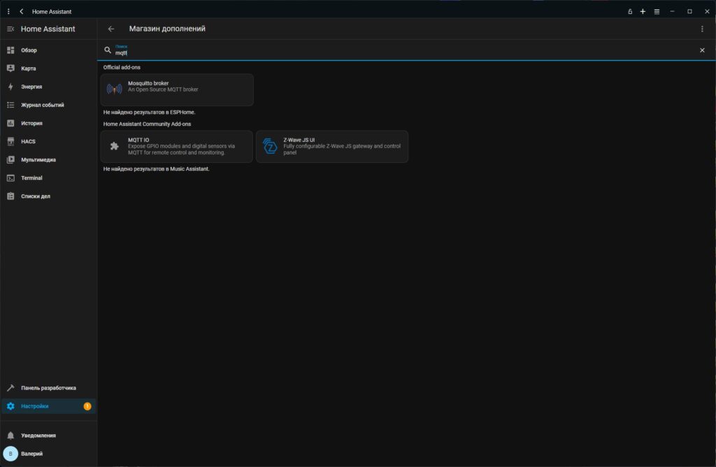 Теперь нужно установить брокера — это как начальник почтальона, который координирует доставку сообщений. Идём в “Настройки” → “Дополнения” → “Магазин дополнений”. В поиске вбиваем “Mosquitto broker” и жмём “Установить”.
