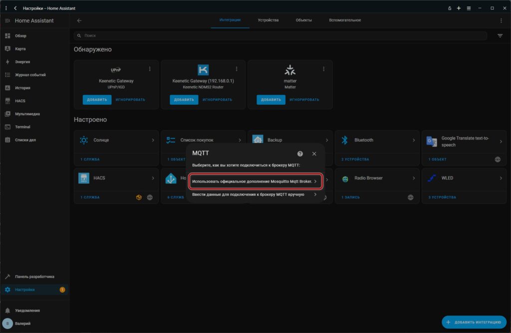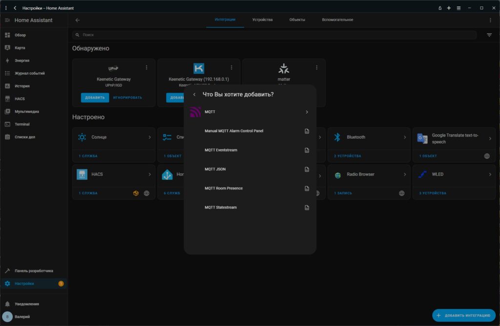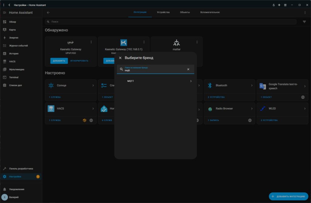 Мы установили брокера, но теперь нужен клиент — тот, кто будет отправлять и получать сообщения. Переходим в “Настройки” → “Интеграции”, жмём “Добавить интеграцию” и вписываем “mqtt”. Выбираем “MQTT”, снова выбираем “MQTT”, и вот мы уже на финишной прямой.